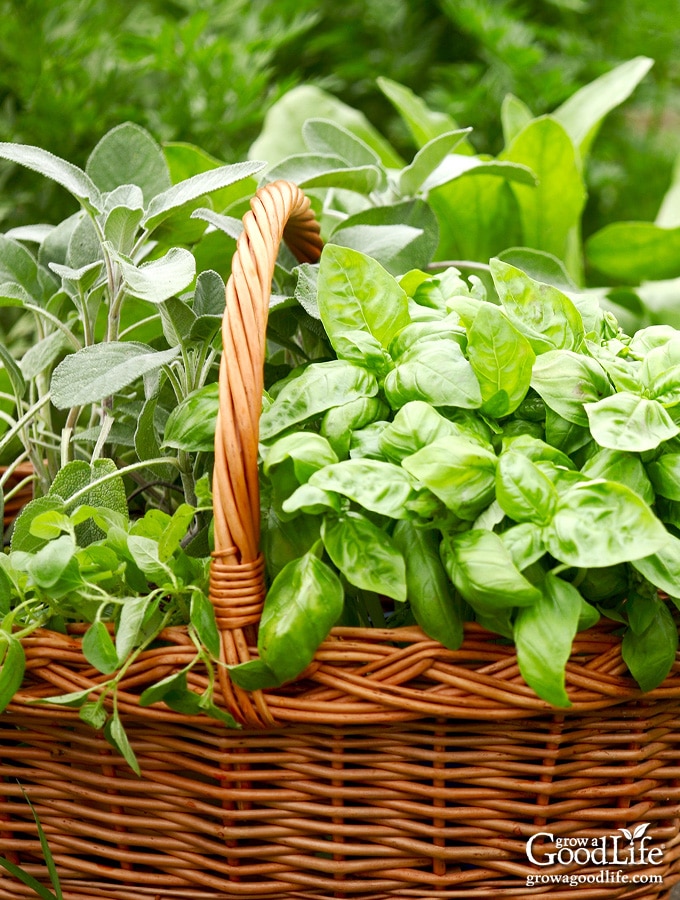 harvest basket with freshly harvested herbs