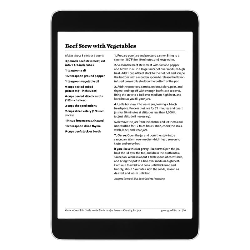 Grow a Good Life Guide to 40+ Meals in a Jar Pressure Canning Recipes is an invitation to preserve delicious home-cooked meals throughout the year. This guide will help you fill your pantry with jars of homemade ready to open and heat up for a warm and cozy meal: